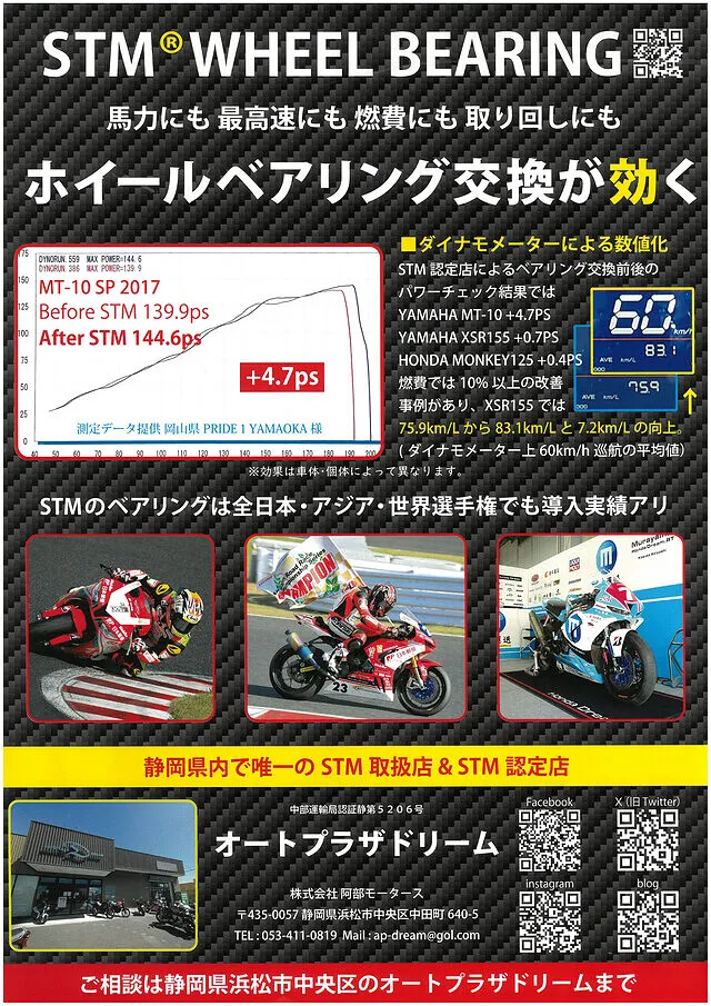 静岡県浜松市のオートプラザドリームでは、STMベアリングを取扱い、「なんとなく乗りにくくなった」「前と感覚が違う」といった小さな違和感にも向き合いながらカスタムや整備を行っています。