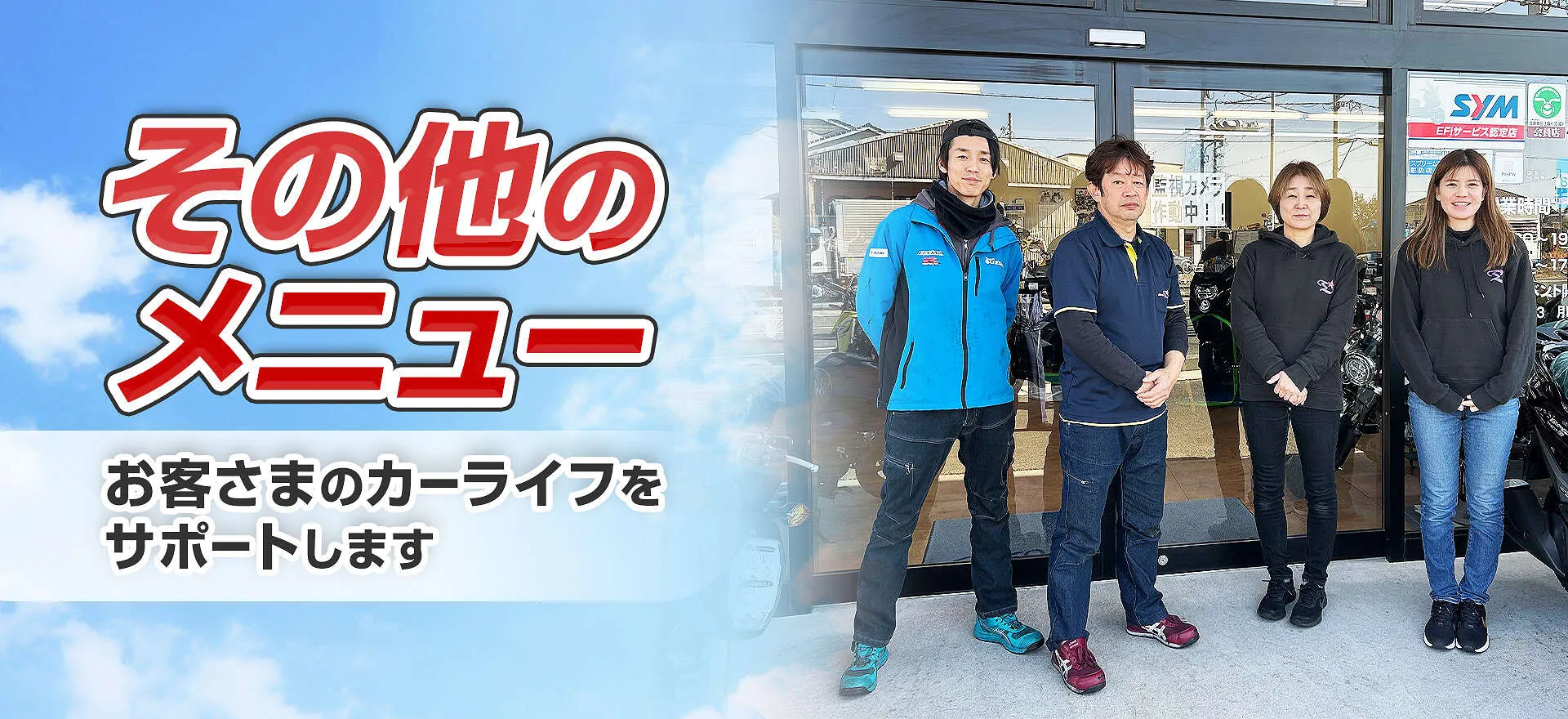 オートプラザドリームでは、バイク販売・カスタム・車検の3つのメインサービスに加え、コーティングや保険、買取など幅広いサポートを行っています。